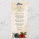 Unique wedding menu card featuring romantic burnt orange and navy blue flowers and green leaves.