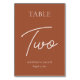 Modern table numbers elevate your wedding reception table décor. The design features an elegant script font in white on a burnt orange earth tone background perfect for a fall wedding or banquet event. Order each table number from the collection or edit this card for each number needed. The design is printed on both sides.
