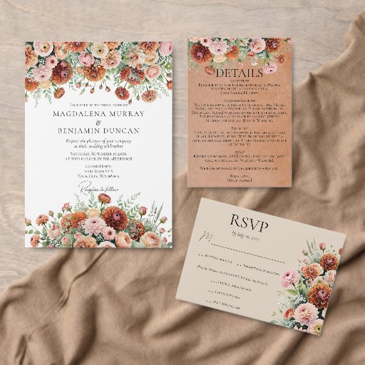 Elegant watercolor floral design featuring dahlia flowers, ranunculus, roses, baby's breath, and lush greenery. This romantic bouquet showcases a rich rust orange teracotta color palette, paired with soft sage green, champagne, and blush pink tones. Ideal for fall weddings, boho themes, and vintage-inspired events. Perfect for rustic chic, modern bohemian, or garden wedding styles.