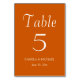 Guide your wedding reception guests to their table with this simple style table number card that features white, stylized lettering on a trendy, burnt orange color background. Design is on each side of card. Edit your card to change table number, wedding couple's names and date. Order cards separately for each table number.