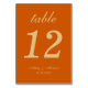 A simple wedding table number for a burnt orange wedding color. It is just golden yellow text on a burnt orange background. Everything except the number itself is written in an elegant calligraphic script.