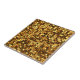 This product is made from a textured 'terra cotta' colored mosaic square tiles pattern in shades of yellow, orange, rust, brown, and black arranged in a random fashion. The texture and mixture of warm earth tones in this unique abstract design give it a look reminiscent of a burnt English muffin.