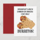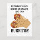 Burritos I Eat Only Burrito Postcard original design by Nisha Prabhu. Get ready to wrap your taste buds in a flavor fiesta! Our vibrant "Burritos: I Eat Only Burritos" postcard is perfect for burrito lovers everywhere. Featuring a colorful design that showcases mouthwatering burritos in all their gooey, cheesy, and perfectly seasoned glory, this postcard serves up a slice of culinary passion. Whether you’re sending cravings to friends, sharing your burrito passion, or just looking for a fun way to brighten someone’s day, this postcard is sure to add a dash of deliciousness to any mailbox. It’s the ideal way to express your love for this quintessential comfort food.