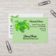 Template for Plant related business. On front a Three dimensional looking mage of a ivy leaves, with business information on pale green background. On back personalize the text to show your business specialties, also has the three leaves in upper left corner on white background.