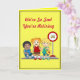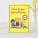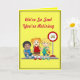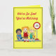 This yellow retirement card is decorated on the front with sad faced children at a school bus stop saying "We're so sad you're retiring" and the inside with happy faced children saying "But we're happy for you all the same." The wording can be changed for occasions other than retirement.