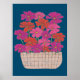 Ink drawing of a basket full of pretty Cosmo flowers in pinks and oranges.