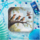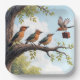 Birds are perched on a tree branch against a backdrop of blue sky while a bird is in flight carrying a small briefcase