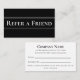 This black and white referral card template has display text you can edit. These refer-a-friend cards have lines to write the friend's name and the name of the customer who made the referral. The other side is black with white stripes going across the card. The white display text between the white stripes says 'Refer a Friend'. All text can be edited or deleted as desired. The faux gold details are artwork and are not made of foil.