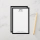 A large black monogram is at the top. A line of black display text is under the monogram for the name. Two lines of black display text are at the bottom. You can edit that text to show a custom message such as your phone number, email address, and street address. All text can be edited or deleted. This professional stationery has a black border.