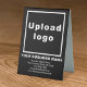 Table sign that you can customize to put your business name and other information of your business. You can display it on your desk as marketing material to advertise your business or to promote your brand name to customers or clients. Customizable signage that you can use to build brand name awareness. Design colors are white texts on black background. To customize this table sign, upload your business logo, type your business name, address, phone number, e-mail and website or your social media page. Please check the appearance after uploading logo and typing texts. If the appearance is pleasing to you, you can place your order now. If you need to resize and move the logo and texts to fit on this table sign, please change in the design tool. You can also make other changes according to the appearance of this table sign that you prefer in the design tool such as changing the background color, font color and font style.