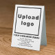 Table sign that you can customize to put your business name and other information of your business. You can display it on your desk as marketing material to advertise your business or to promote your brand name to customers or clients. Customizable signage that you can use to build brand name awareness. Design colors are black texts on white background. To customize this table sign, upload your business logo, type your business name, address, phone number, e-mail and website or your social media page. Please check the appearance after uploading logo and typing texts. If the appearance is pleasing to you, you can place your order now. If you need to resize and move the logo and texts to fit on this table sign, please change in the design tool. You can also make other changes according to the appearance of this table sign that you prefer in the design tool such as changing the background color, font color and font style.