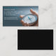 Business card with in the background the image of a hand holding a compass on a degraded blue background.