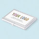 Personalize this professional business card holder with your company logo and custom text. It's a metal business card case with a lid and snap closure and a velvet-like interior. Custom branded business card holders can advertise your business as promotional items or corporate gifts. Your design will be printed in full color. No minimum order quantity and no setup fee.