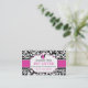 Business Cards For Pet Sitters | Dog Walkers. Make it easy for your clients to contact you with these beautiful and professional pet sitting / dog walker business cards. Black and white damask background with hot pink ribbon and a cat and dog logo to complement the eye catching pet sitter business cards. The back is just as stylish as the front with all the information your clients need to get in touch with you. These pet sitting business cards come in a variety of colors and can be customized with your information using the simple business card template text fields.