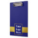 This dark blue clipboard has a display image near the top on the front. You can replace the image with your company logo. The faux gold details are NOT made of foil.