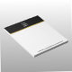 At the top, there's a thick black stripe which has a display image you can replace with your logo. A thin faux gold stripe is under the black stripe. Then there's a white writing area. At the bottom, there's black display text you can replace with your contact information or custom text. The gold look is artwork (not foil).