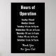 There's white display text you can substitute with a custom message and your daily business hours for Sunday through Saturday. This business hours of operation sign is black. The text is white. All text may be edited or deleted. At the bottom, there's more display text for a custom message (shown: Thank You for Your Visit)