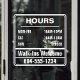 Window sign for store hours of operation. Personalize it with your shop's personal business hours. Add a custom walk-in message and your company phone number. Display it on the front window or door of your location.