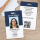 Create a professional appearance with a branded employee ID badge. This editable template can be personalized with your profile photo, name, job title, and company logo. Return details are on the back, along with additional information, and a QR code. Perfect for creating a cohesive branding experience, or simply to verify the identity of the wearer and display their qualifications. This identification badge is ideal for customer-facing roles and corporate settings — from business consultants and retail stores to medical professionals, hospital staff, office workers, conference teams, corporate events and more. Custom badges build brand identity and enhance security. Printed colors: very dark navy blue, gray and white. Vertical format.