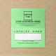 Customizable two fold loyalty card with space for the name of your loyal customers. The color is light green. Font color is dark green. To customize this loyalty card, upload your business logo, type your business or company name, address, phone number, e-mail, website or social media page and validity date of this loyalty card. Please check the appearance after uploading logo and typing texts. If the appearance is pleasing to you, you can place your order now. If you need to resize and move the logo and texts to fit on this loyalty card or on other styles that you will choose, please change in the design tool. You can also make other changes according to your preference in the design tool such as changing the card color, font color, font style, adding image, editing texts, adding texts and deleting texts. Loyalty card for your customers to convince them to buy again in your store or go back again in your shop to avail your service.