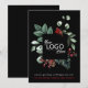 Elegant black corporate Christmas holiday greeting card featuring your business logo framed by a nature-inspired watercolor of a red cardinal and seasonal winter greenery. Personalize your Christmas greeting as well as your business name in simple red and white typography.