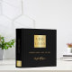 A black background. Personalize and add your business logo, text (or delete) and your name/signature. Golden text.