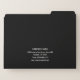 Easily personalize the front and back of these black business file folders with your company logo and other important info. Get organized and make a great first impression with our custom file folders made from thick 14 pt. paper stock. These minimalist file folders can showcase any of your business documents from promotional items to business presentations. The size of these white file folders is 11.75 by 18.25 inches. They are sold in sets of 3. File folders come with gold foil accent labelling stickers.