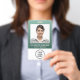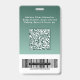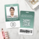 Create a polished and professional look with this custom employee photo ID badge, designed for clear identification and modern branding. This badge features a sage green gradient background, your business logo, a dedicated employee photo area, bold name display, and customizable job title for easy recognition. The reverse side includes a large QR code and barcode section, making it ideal for access control, check-ins, inventory systems, or digital information sharing. Perfect for corporate offices, small businesses, retail and customer-facing teams, healthcare and education staff, events, conferences and security personnel.