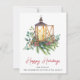 Corporate holiday greeting card featuring a watercolor illustration of a Christmas candle lantern in an arrangement of seasonal pines, eucalyptus berries and greenery. "Happy Holidays" is written in a contemporary red script and you can personalize your greeting and your business' name in simple modern typography. On the reverse, add an additional message of customer appreciation, upload your business logo and input your website address to create a QR code that customers can scan to connect to your online platforms.