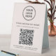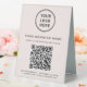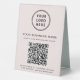 Modern light pink table top tent sign for your business. Upload your website QR code for customers to scan for a list of your products, services and prices. Add your logo and company name, phone number and street address in simple typography.