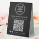 Modern black table top tent sign for your business. Upload your logo and a QR code for customers to scan for a list of your products, services, prices or other information. Add your company name, phone number, website address, etc., in simple white typography.