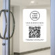 Modern white window cling sign with rounded corners for your business with your QR code for customers to scan for a list of your products, services and prices. Add your logo, business name, QR code, phone number and street address in simple typography.