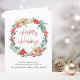 Corporate folded holiday card featuring a watercolor wreath of red and white poinsettia florals and eucalyptus and seasonal greenery. "Happy Holidays" is written in a contemporary red script and you can personalize your greeting and your business' name in simple modern typography. On the inside, add a personalized message of customer appreciation, upload your business logo and input your website address to create a scannable QR code.