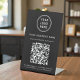 Modern and simple black table top pedestal sign for your business with your website's QR code for customers to scan for a list of your products, services and prices. Upload your Qr code and logo and add your company name, phone number and street address or other information in white text.