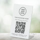 Modern and simple table top pedestal sign for your business with your website's QR code for customers to scan for a list of your products, services and prices. Upload your Qr code and logo and add your company name, phone number and street address or other information.