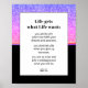 The title of this BossLady Rule is "Life gets what Life wants" from you, from me, from everything in existence. This motivational saying is a powerful message of encouragement to help boss ladies keep going, even when it seems tough. If you're following your dream, you'll find the strength within to reach your goals. The background of our poster is a colorful blue and pink ombre glitter with black below to remind you to dream bigger dreams and keep moving forward. The saying is © Barbara Casey.