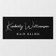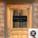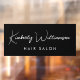 Elegant and chic black window cling for your business with a minimalist vibe featuring your company name or brand in a stylish white signature script and additional text in simple modern white lettering.