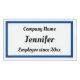 These name tags feature a blue rectangle border to showcase the employee's name, company name, and year the employee began with the company. The background is white and the text is black. The employee's name is written in the center and is the largest text, to make the name easier for another person to read. Easily customize the text on the template forms. Thank you for shopping at CherylsArt on Zazzle.
