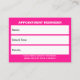 Remind your clients or customers to meet you. Give them the scheduled date and time to meet you. Aside from reminding your customers or clients by giving this appointment card, build brand name awareness, advertise your business or promote your brand name. Appointment card that you can customize to put your business name and with empty spaces to write customer's or client's name, date, time and appointment details or purpose of visit. The color is pink and font color is white. To customize this appointment card, upload your business logo, type your business or company name, address, phone number, e-mail and website or social media page. Please check the appearance on front and back sides after uploading logo and typing texts. If the appearance is pleasing to you, you can place your order now. If you need to resize and move the logo and texts to fit on this appointment card or on other shapes, styles and sizes that you will choose, please change in the design tool. You can also make other changes according to the appearance that you prefer in the design tool such as changing the background color, font color and font style.