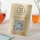 Modern brushed gold faux metallic table top pedestal sign for your business with your QR code for customers to scan to make a payment, to see a list of your products, services and prices, to make appointments, to register, etc. Upload your logo and QR code and add your business name, phone number, street address or other information in simple typography.