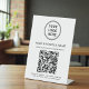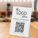Modern table top pedestal sign for your business with your QR code for customers to scan to make a payment, for a list of your products, services and prices, for appointments, to register, etc. Upload your logo and QR code and add your business name, phone number, street address or other information in simple typography. Unlock the potential for increased customer engagement and seamlessly bridge the gap between offline and online experiences, allowing your business to thrive in the digital era.