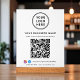 Elevate your counter or reception area with this custom QR code acrylic tabletop sign, designed to make connecting with your business fast, easy, and professional. Featuring a sleek white acrylic panel with an optional modern wood base, this sign highlights your logo, business name, a scannable QR code, and your Facebook and Instagram social media handle in a clean, minimalist layout that complements any space. Perfect for restaurants, cafés, salons, boutiques, offices, clinics, hotels, and events, this tabletop acrylic sign allows customers to instantly view your services, prices, menus, booking page, or website with a single scan. The premium acrylic material offers a polished, high-end look while remaining durable and easy to display on counters, desks, and tables.