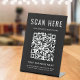 Professional black tabletop pedestal sign for your business with your QR code for customers to scan for a list of your products, services and prices, to view your menu, to make contactless mobile payments, etc. Upload your QR code and add your company name, phone number, website, slogan or other information in simple white typography.
