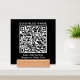 Modern promotional black giclee print tabletop sign with wooden holder for your business or organization. Input your web address to easily create your own scannable QR code and add two lines of white text, such as your company name, slogan, scan instructions, etc.