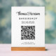 Modern white acrylic tabletop sign featuring your name in a stylish signature script and business type in simple lettering. Input your website address to create a scannable QR code for customers and clients to view your products, services, hours, etc.