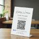 Chic custom pedestal tabletop sign for your business featuring your name in a stylish signature script monogram and business type below in simple modern typography. Input your website address to create a QR code that customers and clients can scan for appointments, products, services, hours, etc. Add your instagram and facebook user ids for customers to follow you on social media. If necessary, adjust font size by editing in the design tool.