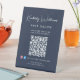 Chic dark blue pedestal tabletop sign for your business featuring your name in a stylish white signature script monogram and business type in simple white typography. Input your website address to create a QR code that customers and clients can scan for appointments, products, services, hours, etc. Add your instagram and facebook user ids for customers to follow you on social media.
