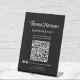 Modern black pedestal tabletop sign for your business featuring your name showcased in a stylish white signature script and business type in simple white lettering. Input your website address to create a QR code that customers and clients can scan for appointments, products, services, hours, etc. Add your instagram and facebook user ids for customers to follow you on social media. You can adjust the script size for longer or shorter names by editing in the design tool.