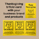 Happy Thanksgiving! Holiday to celebrate this November to thank for the blessings that we received. It is also one of the holidays to advertise your business. Trifold card with Thanksgiving greeting that you can customize to put your business name, products or services and other information of your business. Trifold card as brochure for your business. You can put up to three products or services. Customize it and use it to greet your customers or clients this Thanksgiving and as a marketing material to advertise your business and to promote your products or services. Design colors are black texts on yellow background. To customize this trifold card, upload your business logo and images of your products or services. Type also your business name, address, phone number, e-mail, website or your business social media page and short attractive description of your products or services. Please check the appearance on all sides after uploading images and typing texts. If the appearance is pleasing to you, you can place your order now. If you need to resize and move the images and texts to fit on this trifold card, please change in the design tool. You can also change the background color, font color and font style in the design tool. Advertise your business. Promote your brand name. Customizable trifold card that you can use to build brand name awareness. Happy Thanksgiving! Wishing you more sales this holiday season.