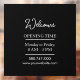 Greet your customers with this professional business welcome and open hours window cling. Easily customize with your business name, logo, and operating hours for a clean, modern look. Perfect for storefronts, cafes, offices, and small businesses, this removable cling enhances visibility and ensures your clients know when you’re open, making a great first impression.
